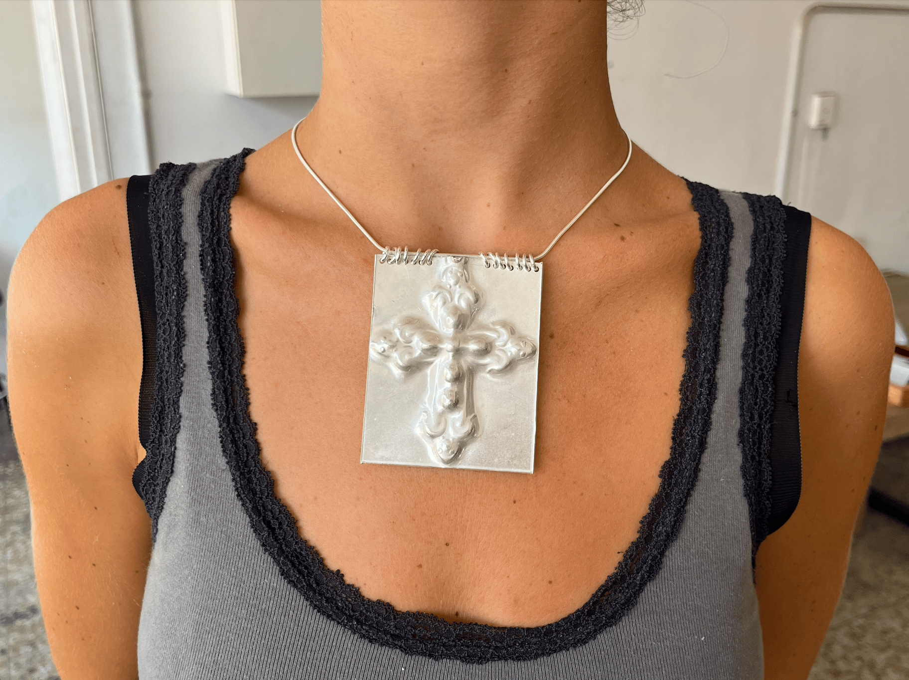 A cross of liquid silver, solidified just in time.